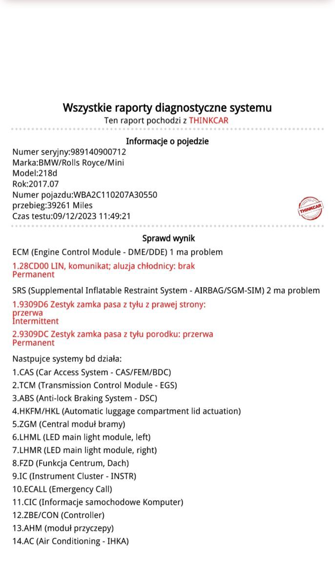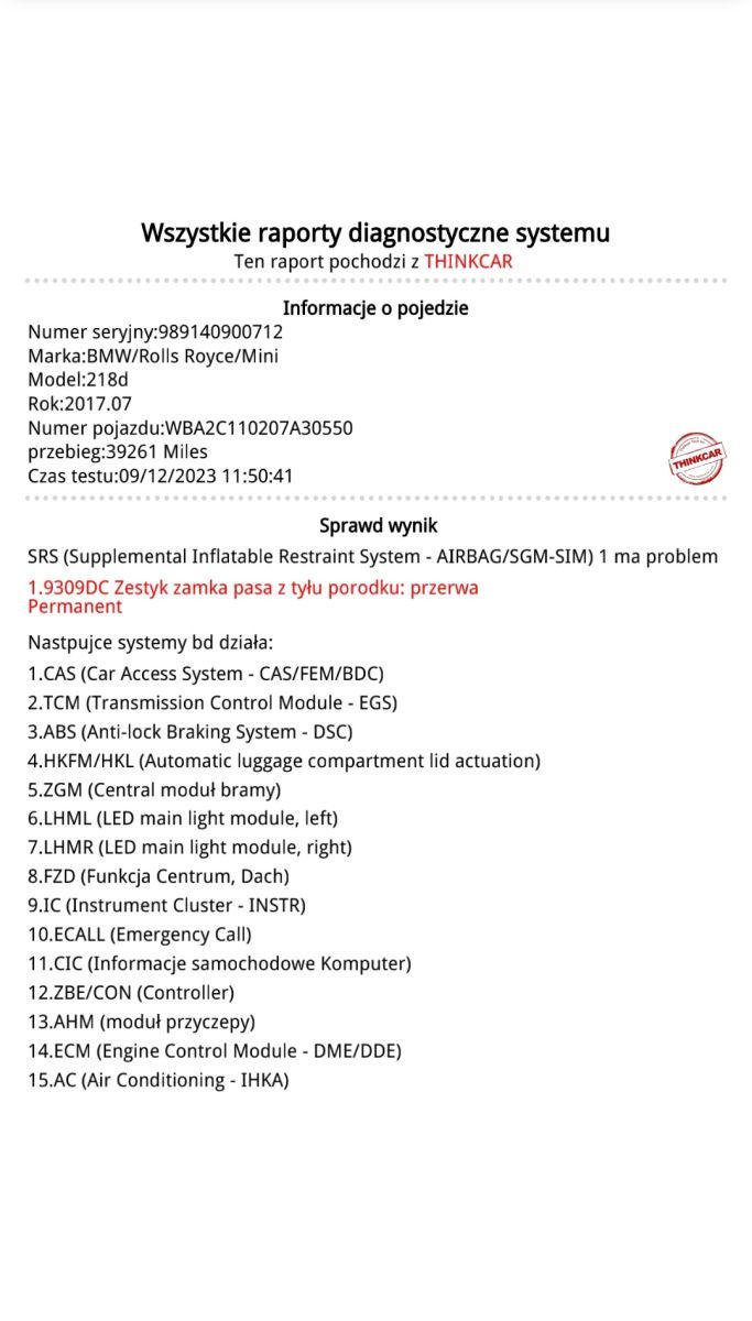 - sterowniku poduszek:dwa błędy dotyczące zestyku zamka pasa pasażera siedzącego pośrodku na tylnej kanapie - tu tylko jeden błąd się udało skasować, drugi pozostał - konieczna dalsza diagnoza i poszukiwanie usterek, aby zlokalizować uszkodzenie.
